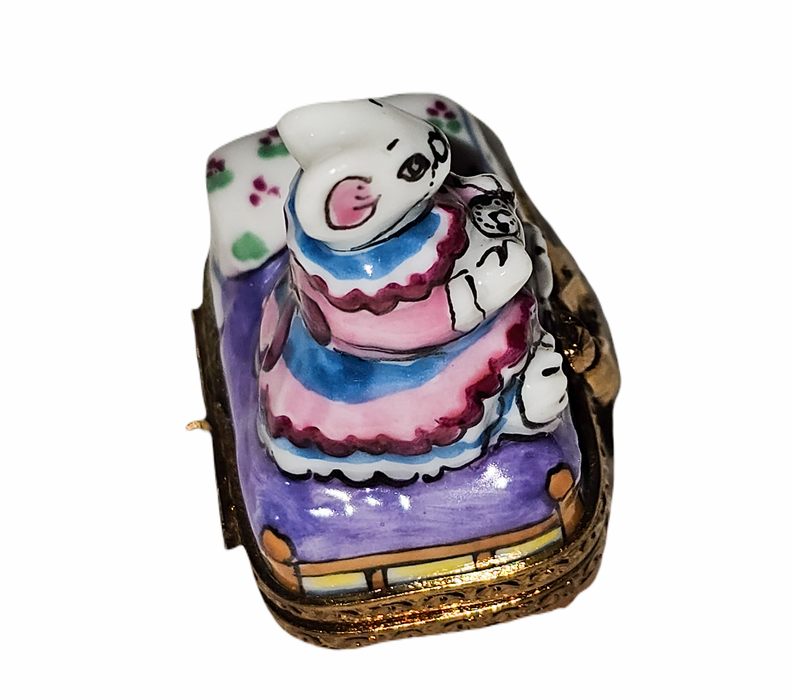 Introducing the delightful Cozy Mouse Bed Limoges Box, a charming piece that captures the whimsy of a cozy bedtime scene, making it an enchanting addition to any collection or a thoughtful gift for loved ones.