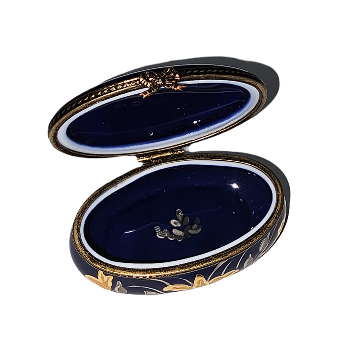 Gold Silver Flowers on Blue Cobalt Oval Limoges Box