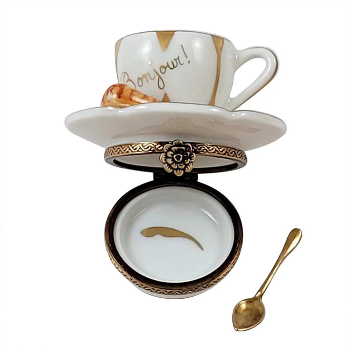 Indulge in a touch of French elegance with the Bonjour Cup of Coffee w Croissant from the renowned Rochard Brand. This exquisite Limoges Box captures the essence of a delightful French morning, making it an enchanting addition to your home decor or a thoughtful gift for coffee lovers.